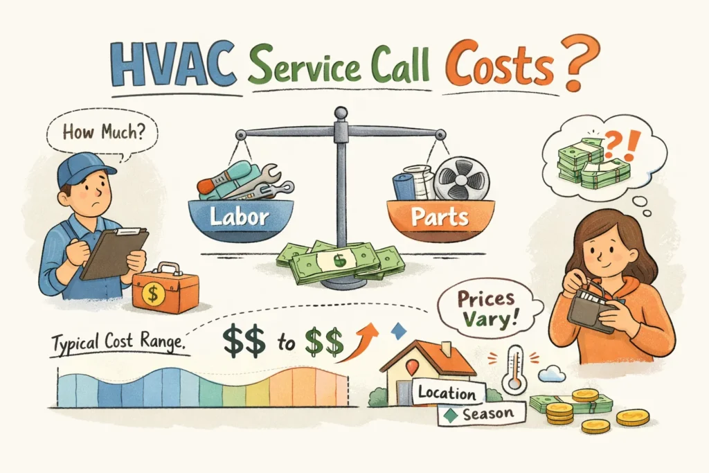 Most homeowners pay between $75 and $250 for an HVAC service call, with standard residential visits usually landing between $95 and $220. That range reflects the price, the technician’s scope of work and how urgently you need the visit. Below you’ll find a clear breakdown of diagnostic fees, travel and add-on charges so you can judge whether an AC or furnace service call price is fair for your area.